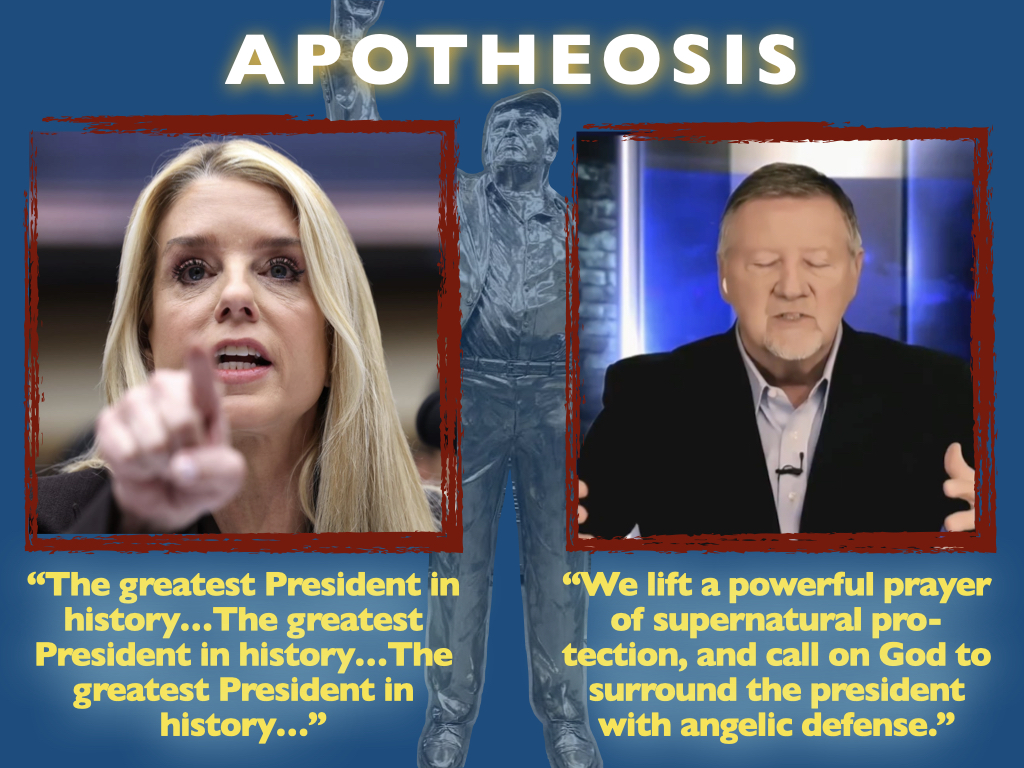 What distinguishes APOTHEOSIS from normal popularity is A. the “demand for verbal adulation”, (the effusive glorification we heard from Bondi yesterday) B. unquestioned, final control over the narrative, and C. a “circle-the-wagons” defense of the leader himself, (what we see in Dutch Sheets’ appeal below) …all of which flows from the living leader him/herself.
