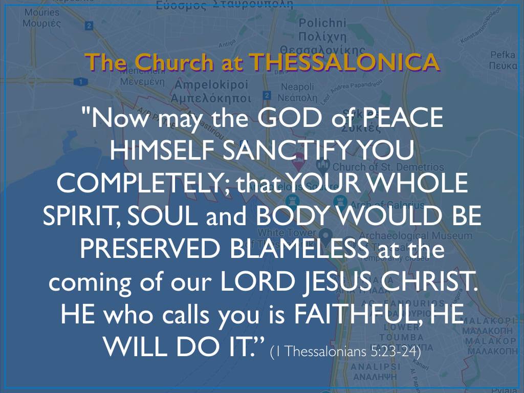 “Rejoice always. Pray without ceasing. In everything give thanks; for this is the will of God in Christ Jesus for you. Do not quench the Spirit. Do not despise prophecies. Test all things; hold fast what is good. Abstain from every form of evil. NOW MAY THE GOD OF PEACE HIMSELF SANCTIFY YOU COMPLETELY; AND MAY YOUR WHOLE SPIRIT, SOUL AND BODY BE PRESERVED BLAMELESS AT THE COMING OF OUR LORD JESUS CHRIST. HE WHO CALLS YOU IS FAITHFUL. HE WILL DO IT!” (1 Thessalonians 5:16-24)