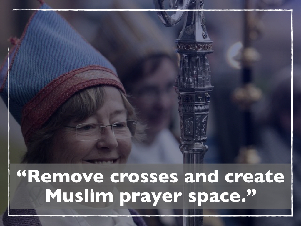 We’ve actually been here for some time now. This 2015 article reports that a lesbian bishop in the Church of Sweden (there are now several lesbian bishops in numerous denominations world-wide) advocated that Christian churches remove the crosses from their buildings in order to create friendly space where Muslims (and people of other religious faiths) may feel more comfortable to pray.