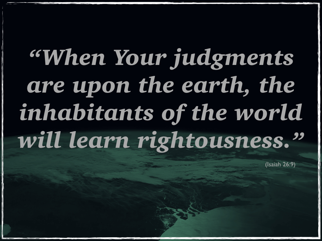 9 With my soul I have desired You in the night, yes, by my spirit within me I will seek You early; for WHEN YOUR JUDGMENTS ARE IN THE EARTH, THE INHABITANTS OF THE WORLD WILL LEARN RIGHTEOUSNESS.