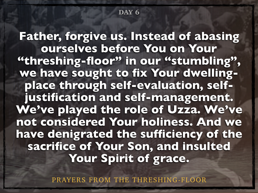 “So they carried the ark of God on a new cart from the house of Abinadab, and Uzza and Ahio drove the cart. Then David and all Israel played music before God with all their might, with singing, on harps, on stringed instruments, on tambourines, on cymbals, and with trumpets. And when they came to the THRESHING FLOOR, UZZA put out his hand to hold the ark, for the oxen stumbled. Then the anger of the Lord was aroused against UZZA, and He struck him because he put his hand to the ark… David was afraid of God that day, saying, ‘How can I bring the ark of God to me?'” (1 Chronicles 13:7-10,12)