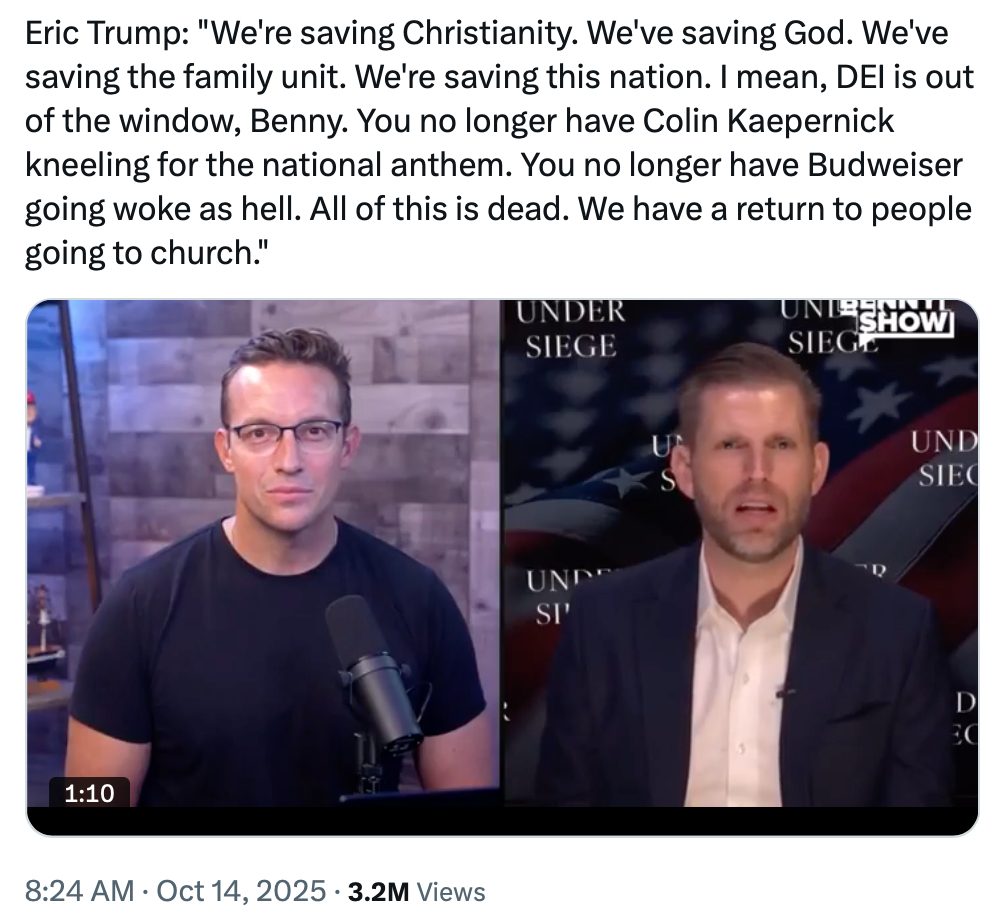 When he and his administration rewrite U.S. history to diminish the truth about our “Christian nation’s” sins against blacks, and native Americans etc., our world hears, “Humility, repentance and contrition are not necessary to the establishment of a righteous nation.” Note that what’s of greatest concern to this Christian Nationalist argument is the glory of the nation – not the integrity of the Bride.