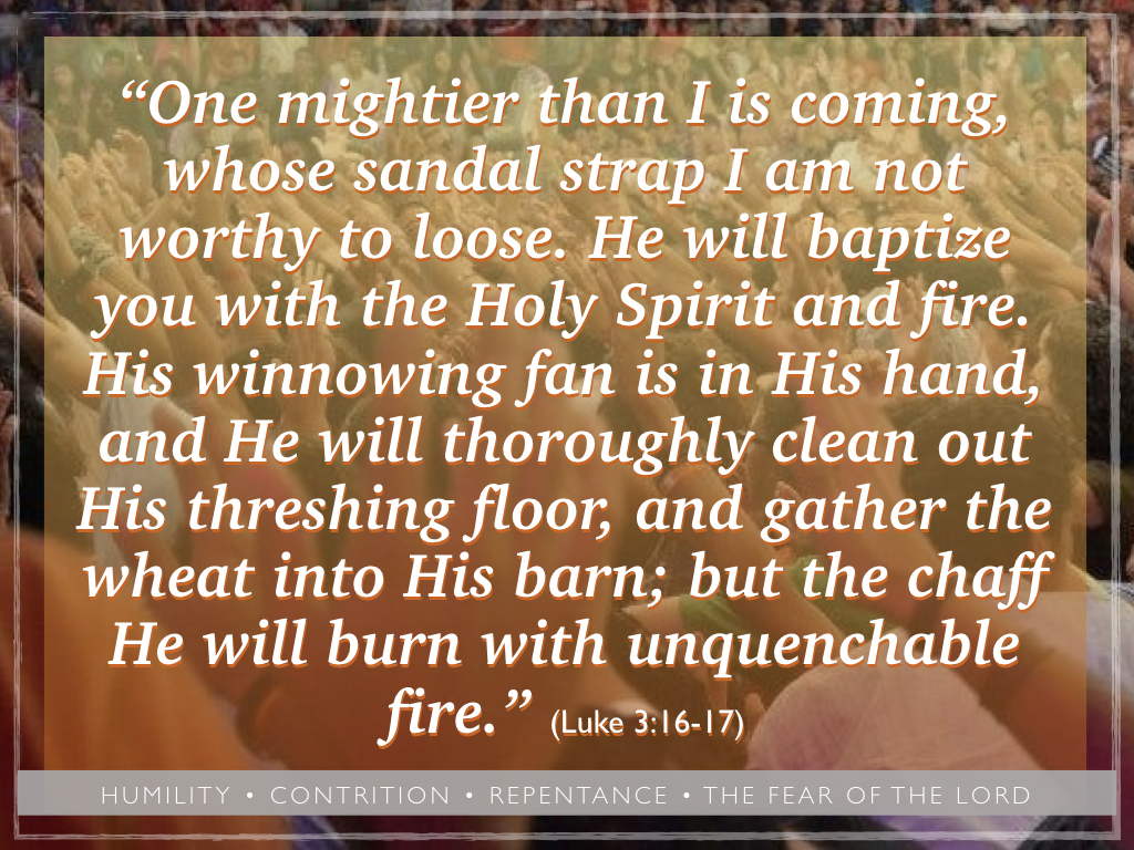 “One mightier than I is coming, whose sandal strap I am not worthy to loose. He will baptize you with the Holy Spirit and fire. His winnowing fan is in His hand, and He will thoroughly clean out His threshing floor, and gather the wheat into His barn; but the chaff He will burn with unquenchable fire.” (Luke 3:16-17)