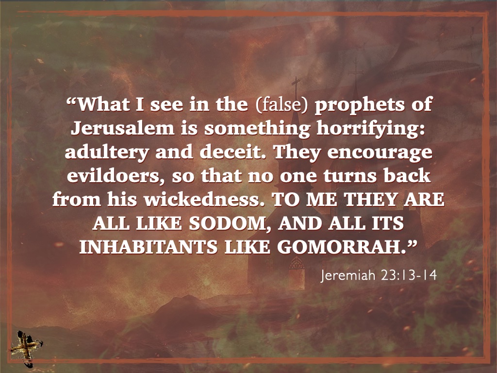 In the prophets of Samaria I saw a repulsive thing: They prophesied by Baal and led My people Israel astray. But what I see in the prophets of Jerusalem is something horrifying: adultery and false dealing. They encourage evildoers, so that no one turns back from his wickedness. TO ME THEY ARE ALL LIKE SODOM, AND ALL ITS INHABITANTS LIKE GOMORRAH. (Jeremiah 23:13-14).